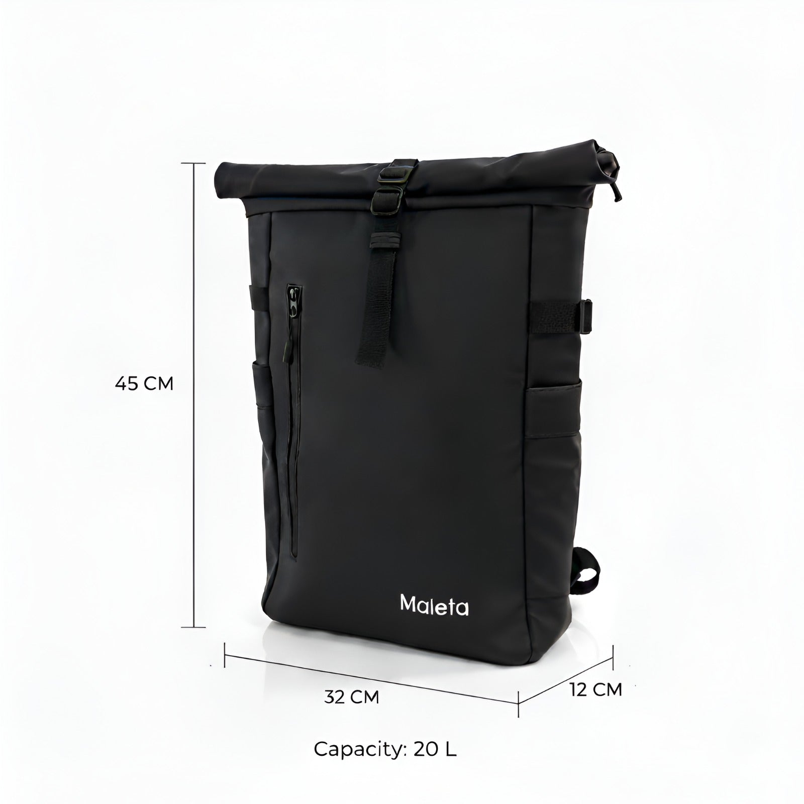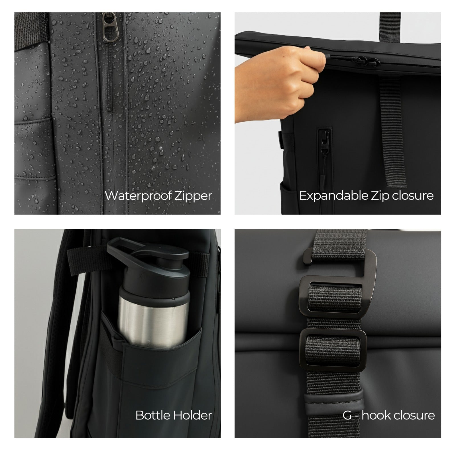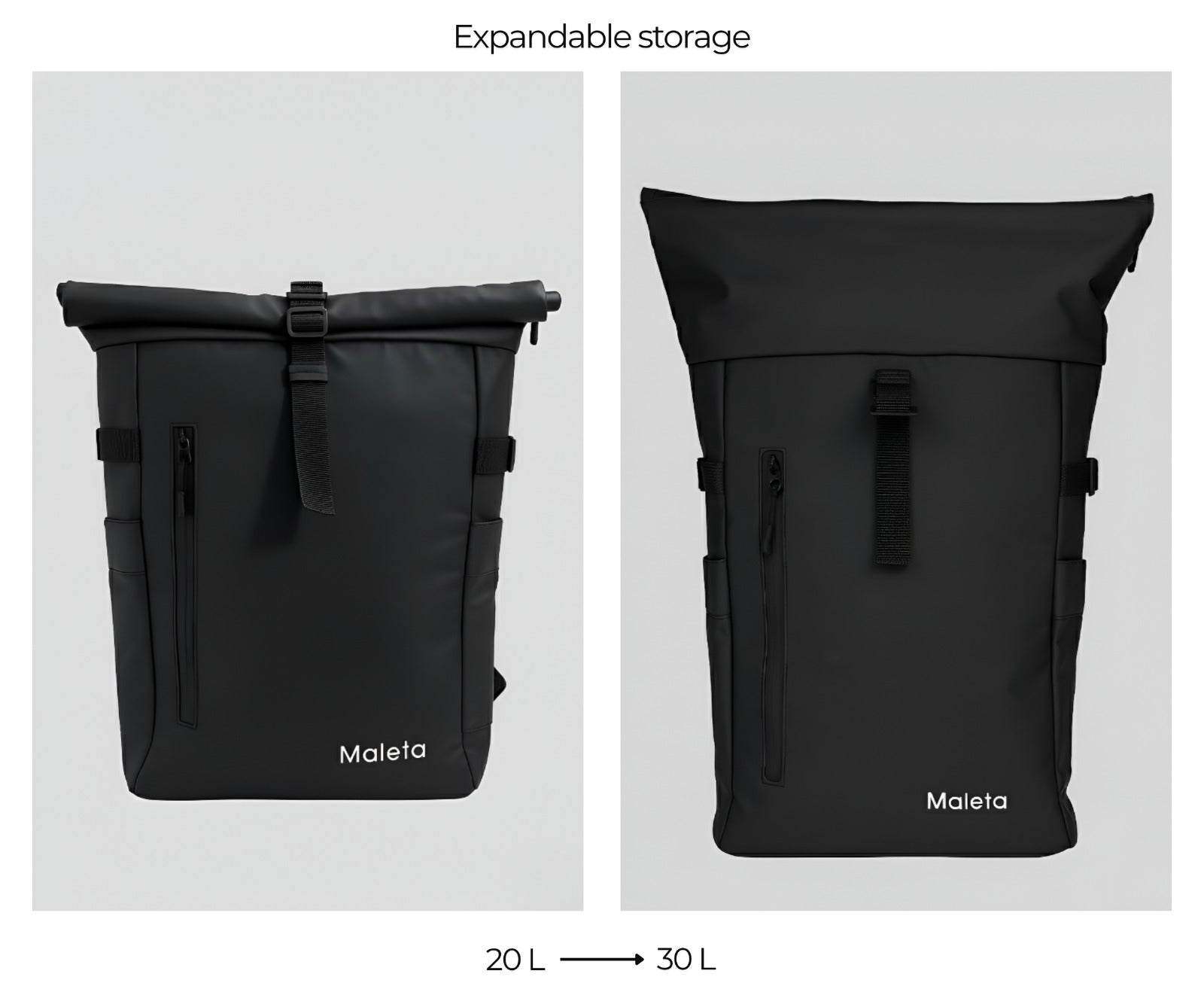 Expandable Capacity - Expands from 20L to 30L with zip closure system. G-Hook rolltop design.