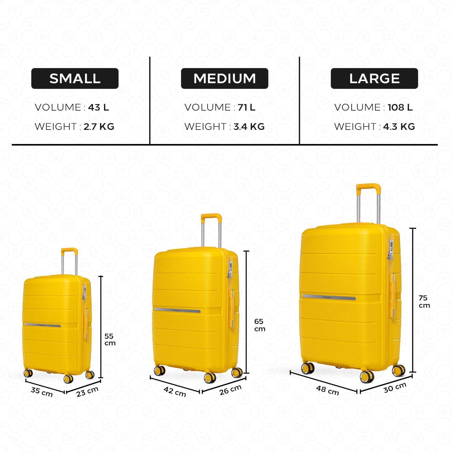 • Comprehensive Set for All Needs: The set includes a 20-inch Cabin bag (10 kg capacity, 35x23x55 cm), a 24-inch Medium Check-in bag (20 kg capacity, 42x26x65 cm), and a 28-inch Large Check-in bag (25 kg capacity, 48x30x75 cm), catering to both short trips and extended travel.